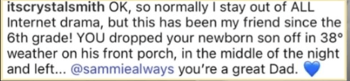 Renay addressed the situation in a post that began making the rounds online, writing, “OK, so normally I stay out of ALL Internet drama, but this has been my friend since the 6th grade.” She added, “Play with somebody else,” and described Sammie as a “great dad,” while alleging that the baby was left outside in 38-degree weather.
