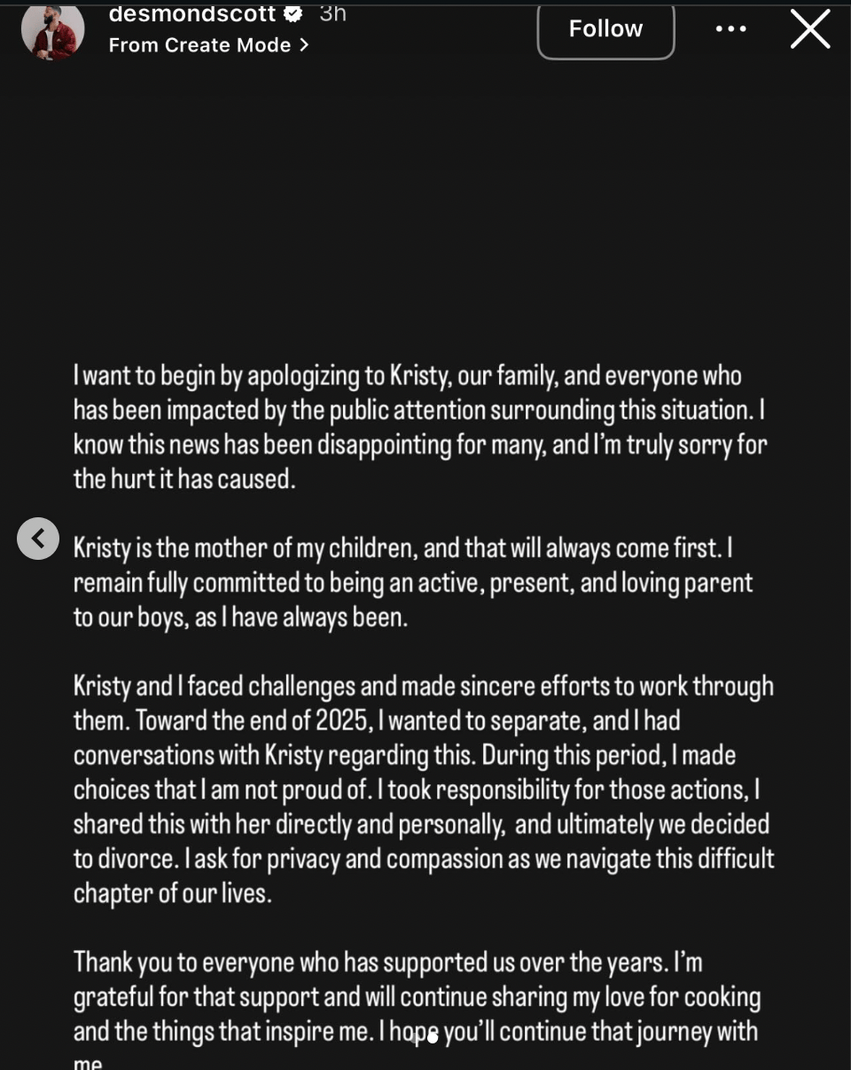 After the breakup made headlines, Desmond posted a public apology to Instagram, saying he and Kristy had “faced challenges” and that he had made “sincere efforts” to work through them, though he did not directly address the infidelity allegations swirling around the divorce.