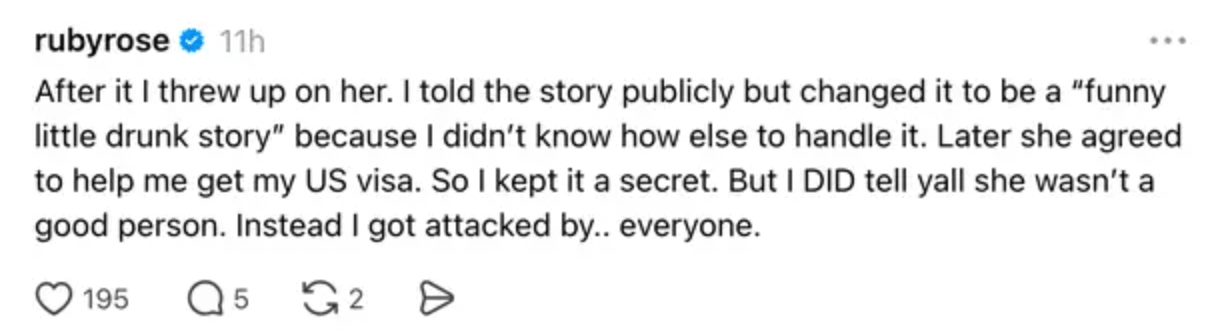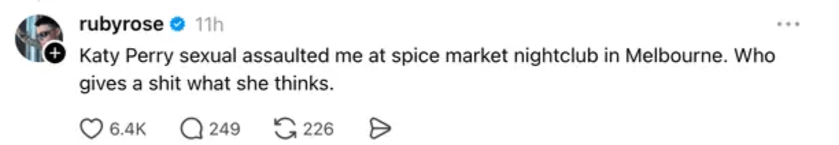 Rose alleged in a series of Threads posts that the incident took place years ago in Melbourne, Australia. She claimed she had kept the alleged assault secret because Perry had supposedly agreed to help her obtain a US visa. In one of the posts, Rose described the alleged encounter in graphic detail and said the incident had stayed with her for years.