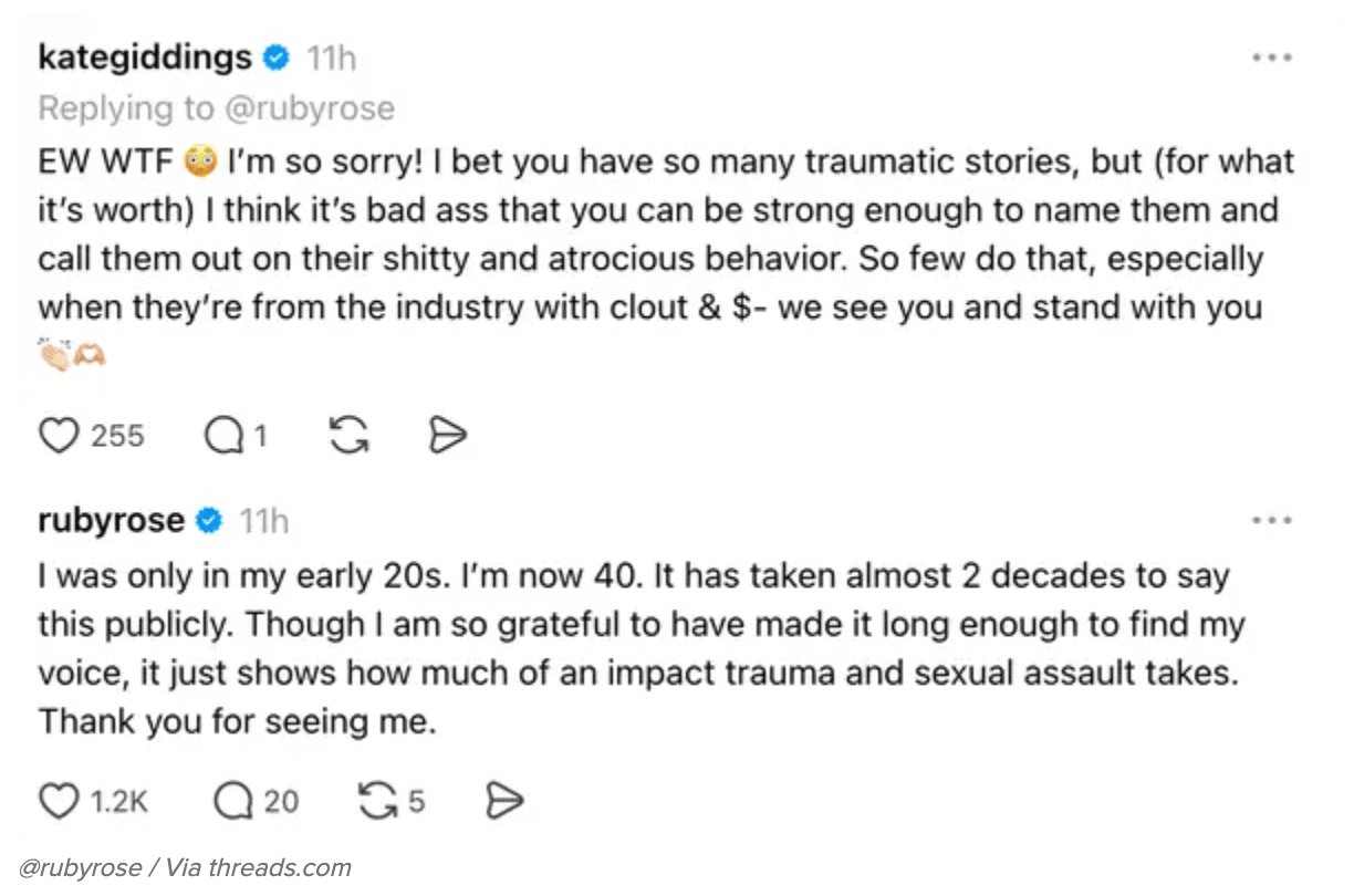 In a separate post, Rose said she was only in her early 20s at the time and is now 40, adding that it had taken her almost two decades to speak publicly. She said the delay showed the lasting impact of trauma and sexual assault.