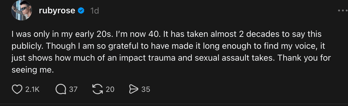 Rose later shared graphic details of the alleged encounter in replies to fans, saying it happened when she was in her early twenties. She also claimed she later downplayed the experience publicly by framing it as a “funny little drunk story” because she did not know how else to process it.