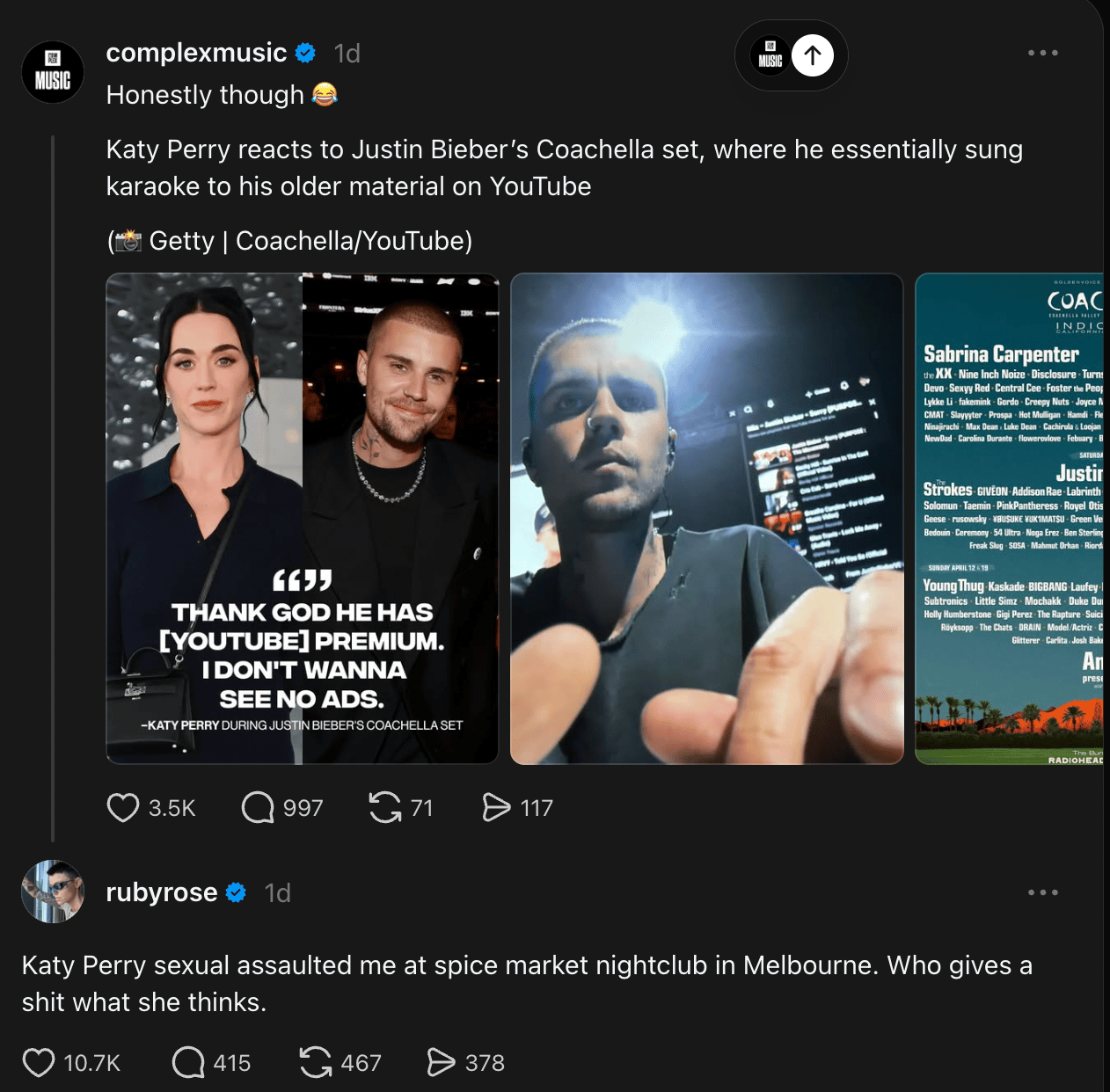 The allegation came after Perry attended Coachella with partner Justin Trudeau for Bieber’s April 11 headlining set. A Complex post about Perry joking over Bieber watching YouTube videos onstage appears to have sparked Rose’s response.