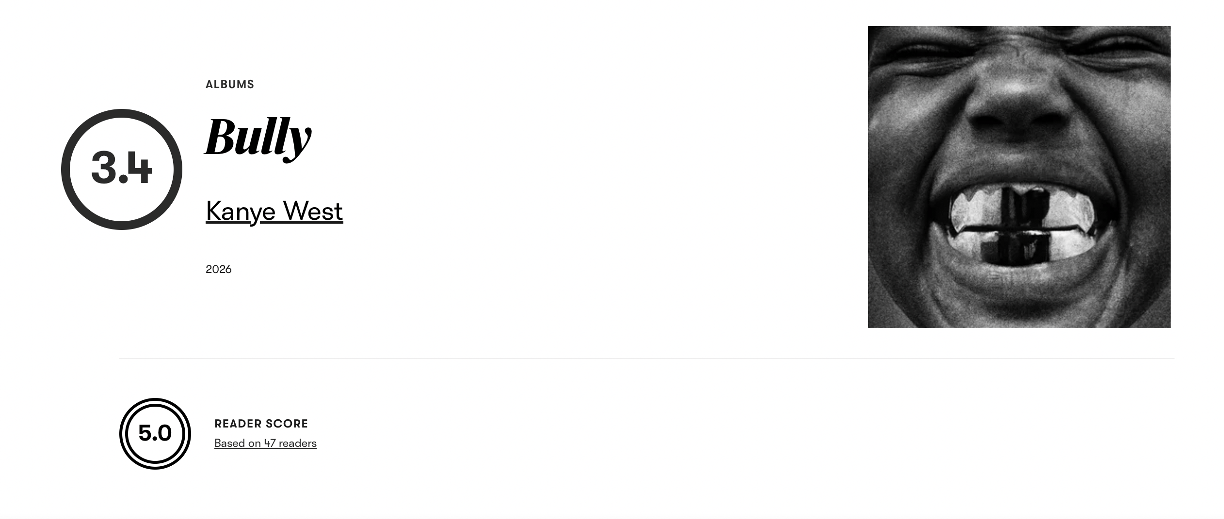 For now, that is what makes this Pitchfork fight feel bigger than a single review cycle. Gamma may have helped turn the score into a rallying point for Ye’s base, but the real test for Bully is whether the album can keep moving as a piece of music once the outrage posts die down. Right now, it is still fighting for room in a rollout that keeps getting swallowed by everything around it.