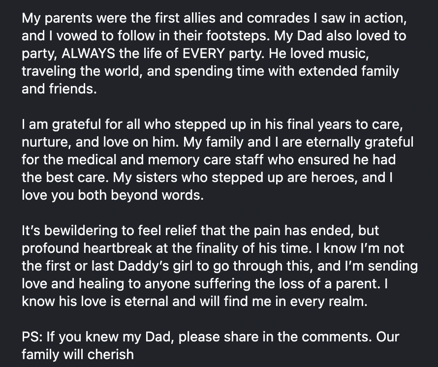 Union also thanked the people who cared for him in his final years, including medical staff, memory care workers and her sisters, whom she called heroes. Her father had been in memory care since 2023, something she had spoken about before while discussing how dementia had reshaped her life and career choices.
