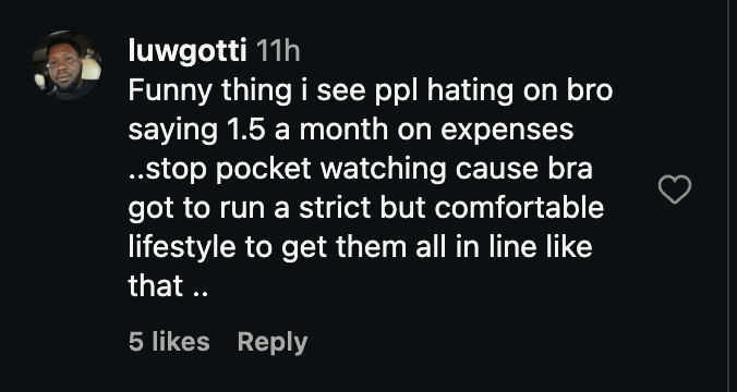 “Right now, I have to spend 1.5 a month on all of them combined,” he said. “It take 1.5 million a month to live my lifestyle, take care of them, take care of everybody.”