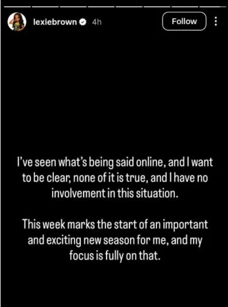 The breakup quickly turned into a wider online storm after social media users began speculating that WNBA player Lexie Brown was somehow involved. Brown later shut the rumors down on Instagram, writing, “I’ve seen what’s being said online, and I want to be clear, none of it is true, and I have no involvement in this situation.
