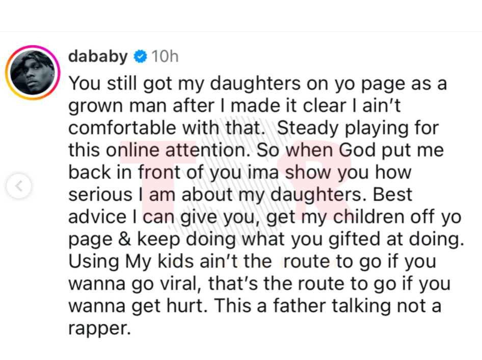The conversation only got louder after a screenshot of DaBaby addressing the artist directly on Instagram began making the rounds. In the message, he wrote, “You still got my daughters on yo page as a grown man after I made it clear I ain’t comfortable with that. Steady playing for this online attention. So when God put me back in front of you ima show you how serious I am about my daughters. Best advice I can give you, get my children off yo page & keep doing what you gifted at doing. Using my kids ain’t the route to go if you wanna go viral, that’s the route to go if you wanna get hurt. This a father talking not a rapper.”