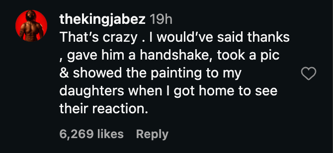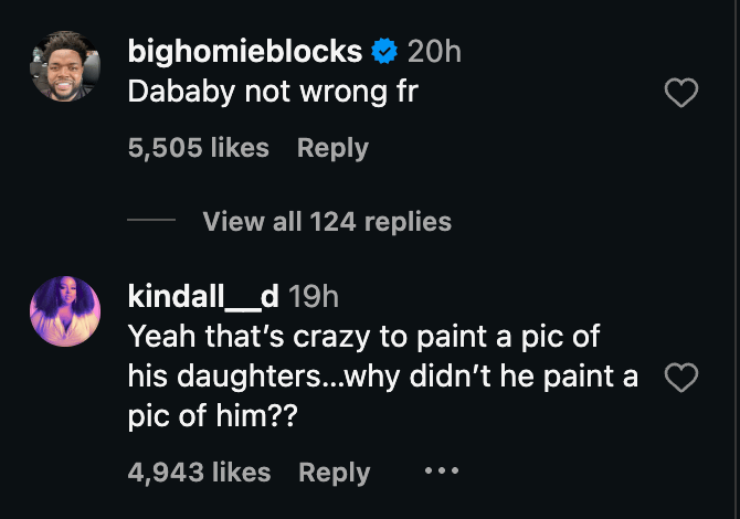 Online, people are split. Some backed DaBaby immediately, with one person writing, “DaBaby not wrong fr.” Another said, “Yeah that’s crazy to paint a pic of his daughters... why didn’t he paint a pic of him??” A third added, “That’s crazy. I would’ve said thanks, gave him a handshake, took a pic & showed the painting to my daughters when I got home to see their reaction.” So while some people feel DaBaby was fully justified in shutting it down, others think he could have handled the moment differently even if his concern as a father was valid.